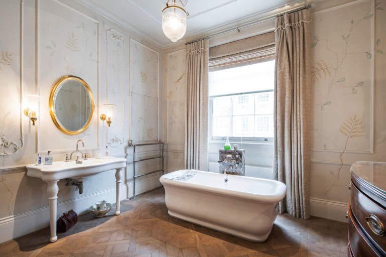 The en suite bathroom is finished in a delicate wallpaper with panelling and a grand freestanding bathtub.