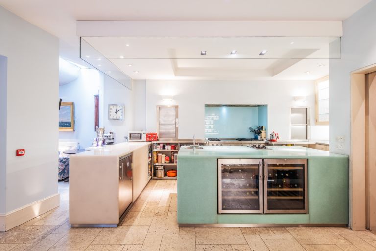 The kitchen features a kitchen island with built-in wine fridges (we’d loved to have been a fly on the wall when Sting entertained guests here), as well as other integrated appliances.
