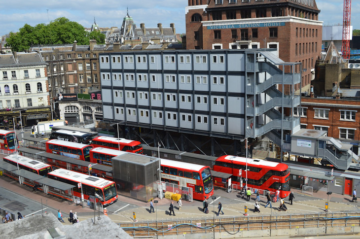But there’s a snag. The surfaces of London buses are mostly not red. This becomes clear when seen from above. Here’s a view we somehow managed to get from Victoria station.
