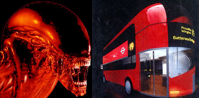 New Routemasters, like the one leading the pack in our photo, are decidedly more crimson than their stablemates. Seen from behind, they also look a lot like the alien from Alien, though that’s neither here nor there.